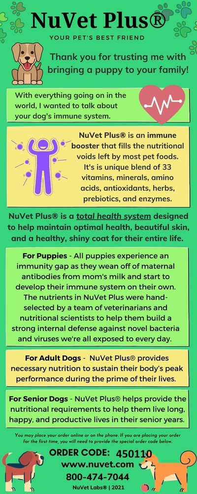 The NuVet Plus Powder is 100% made with real chicken liver so that even your most finicky picky dogs or puppies will love! It can be used on wet or dry food. Designed for ALL breeds, sizes and ages of dogs. From puppies up to seniors. It gives your pet a stronger immune system, strengthens their heart, lungs, liver, kidneys, nervous system, muscle development and connective tissues. NuVet Plus Powder is full of the proper vitamins, minerals and a complete antioxidant intake. It’s balanced to improves metabolism of proteins, fats and carbohydrates, increases energy, joints and motility and gives your dog or puppy that extra resistance to diseases as well as aids in preventing your pet from getting various serious long-term health problems, especially at an early age and much more!! So with their products your pet has nothing to lose and everything to gain. We strongly believe in providing our dogs and their babies with everything they need to have the best start to help them live long, healthy, happy lives!